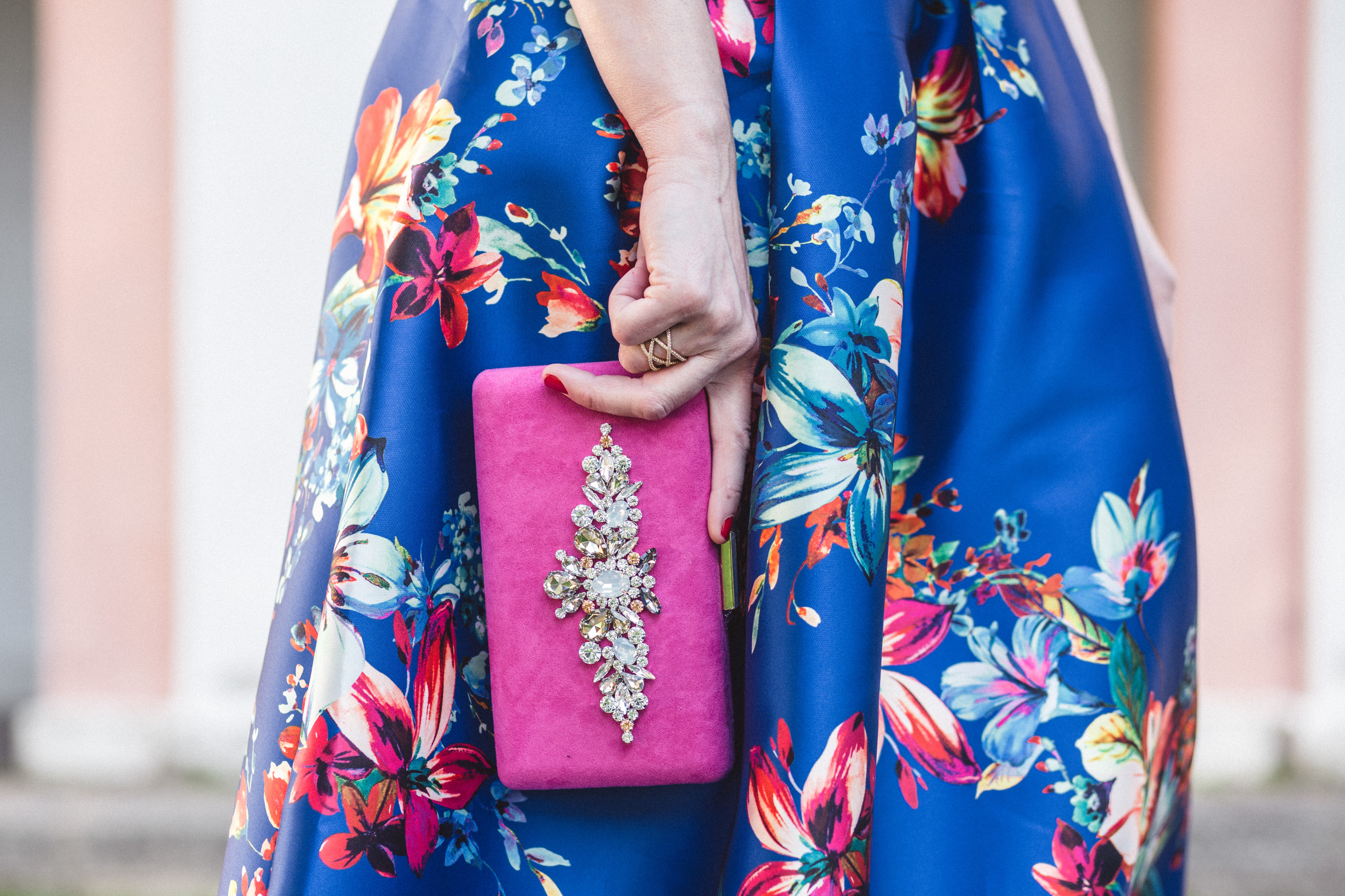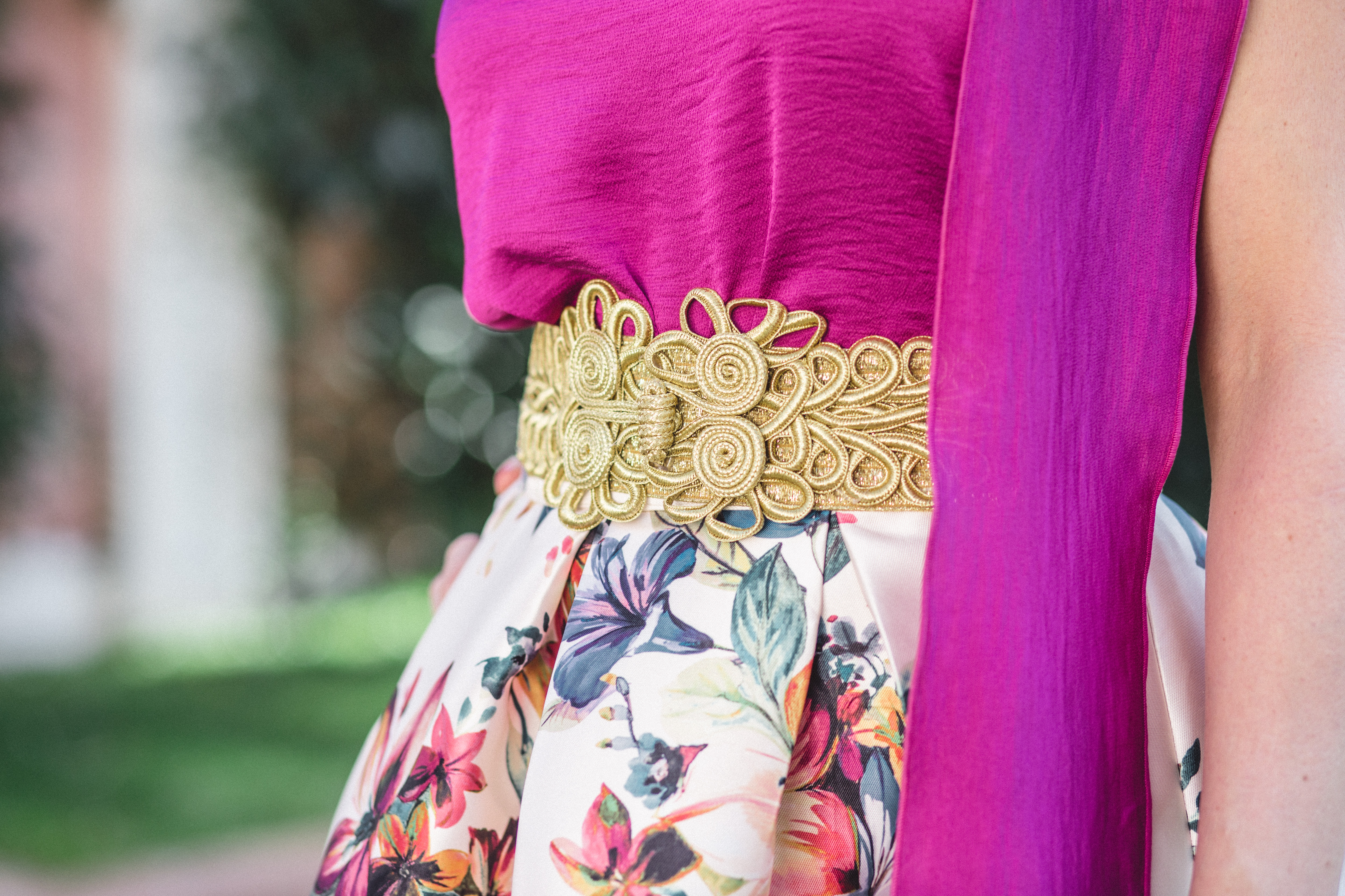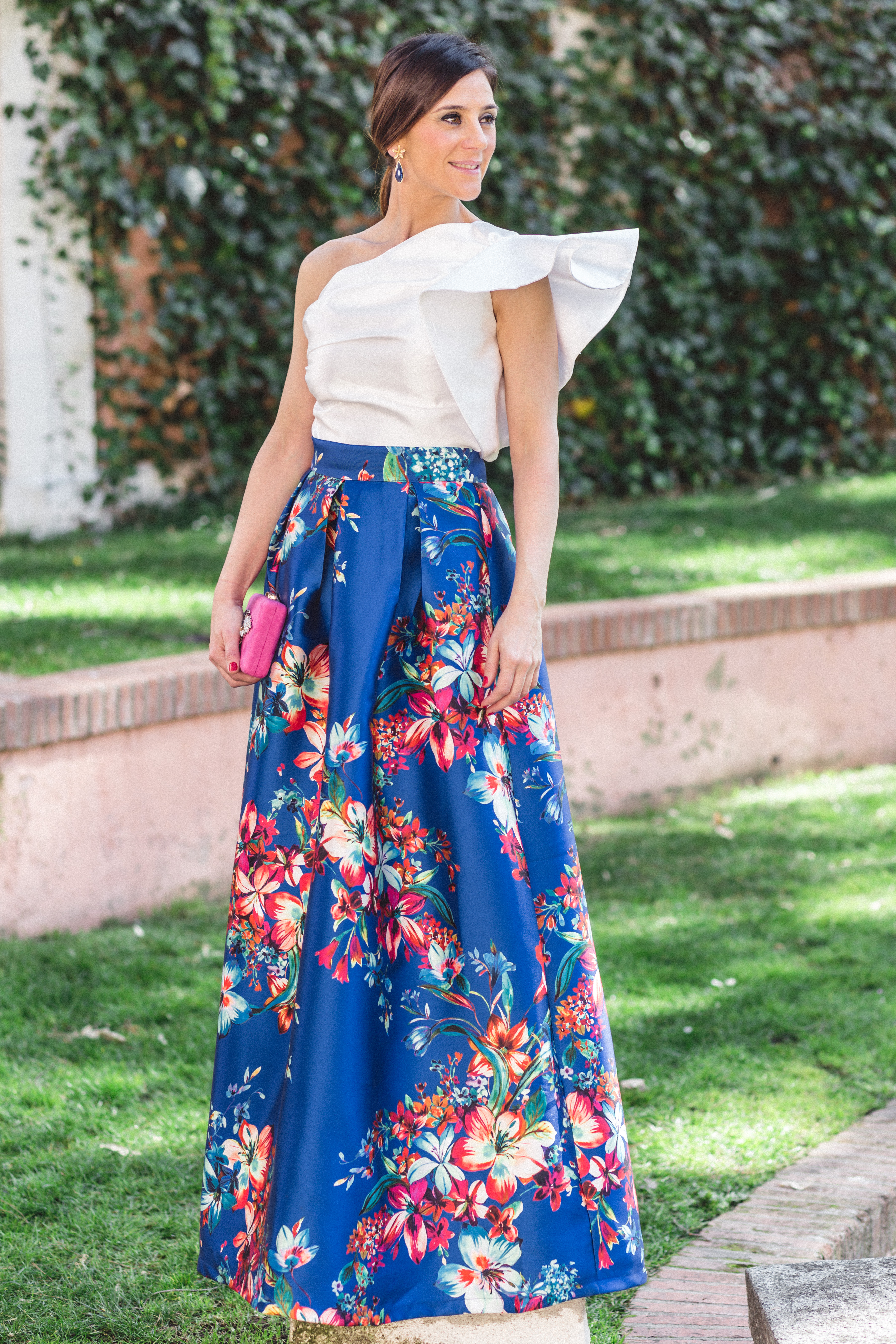 Si preferís los tonos claros, la tenéis en crudo con las flores en azul grisáceo y tonos rosas, combinada con una blusa en color buganvilla queda espectacular. En este caso la blusa es de raso con lazo en hombro dejando la lazada suelta y el otro hombro al descubierto.