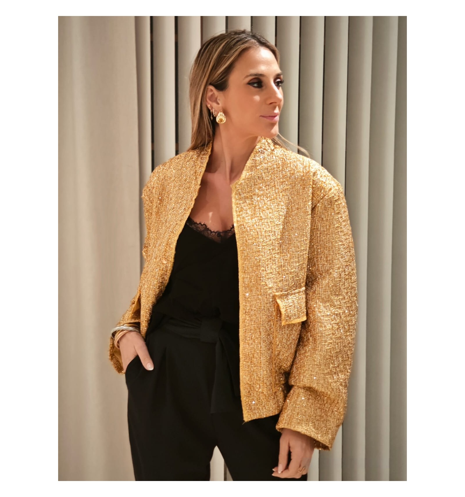ESTA CHAQUETA RESALTA CON SUS BRILLANTES LENTEJUELAS DORADAS.