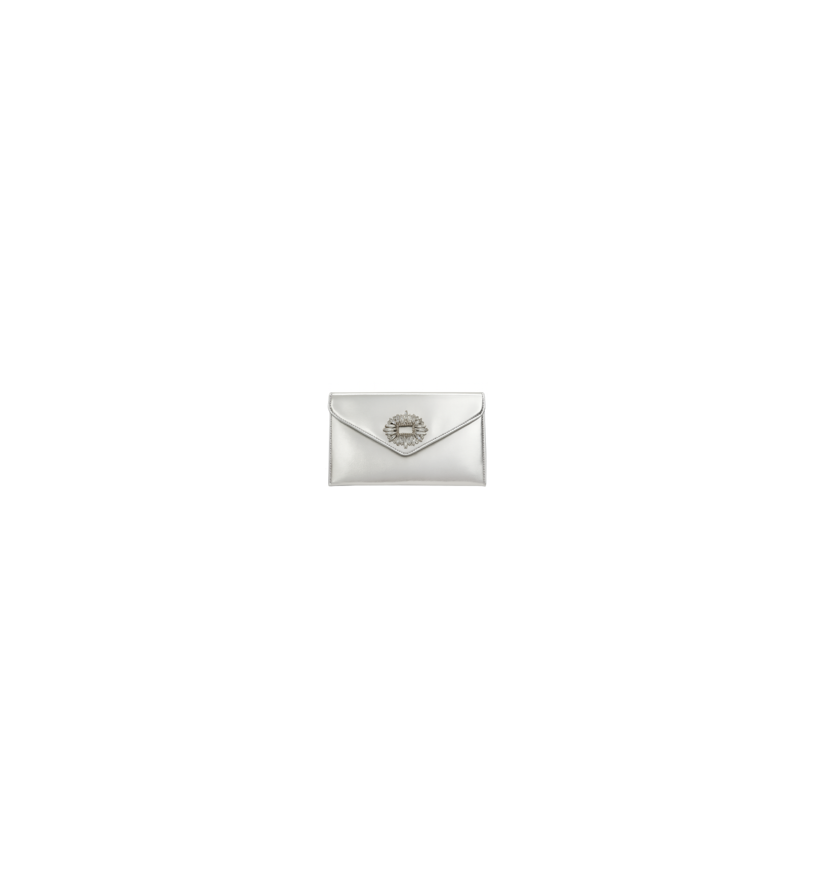 ESTE CLUTCH RECTANGULAR EN TONO PLATA METALICA TIENE UNA SUPERFICIE BRILLANTE TIPO ESPEJO QUE REFLEJA LA LUZ CON CADA MOVIMIENTO. SU DISEÑO SE REALZA CON UNA SOLAPA EN PICO ADORNADA POR UN BROCHE CENTRAL DE INSPIRACION JOYA: UNA ESTRUCTURA RECTANGULAR RODEADA POR CRISTALES SIMETRICOS QUE EVOCAN GLAMOUR Y DISTINCION.
