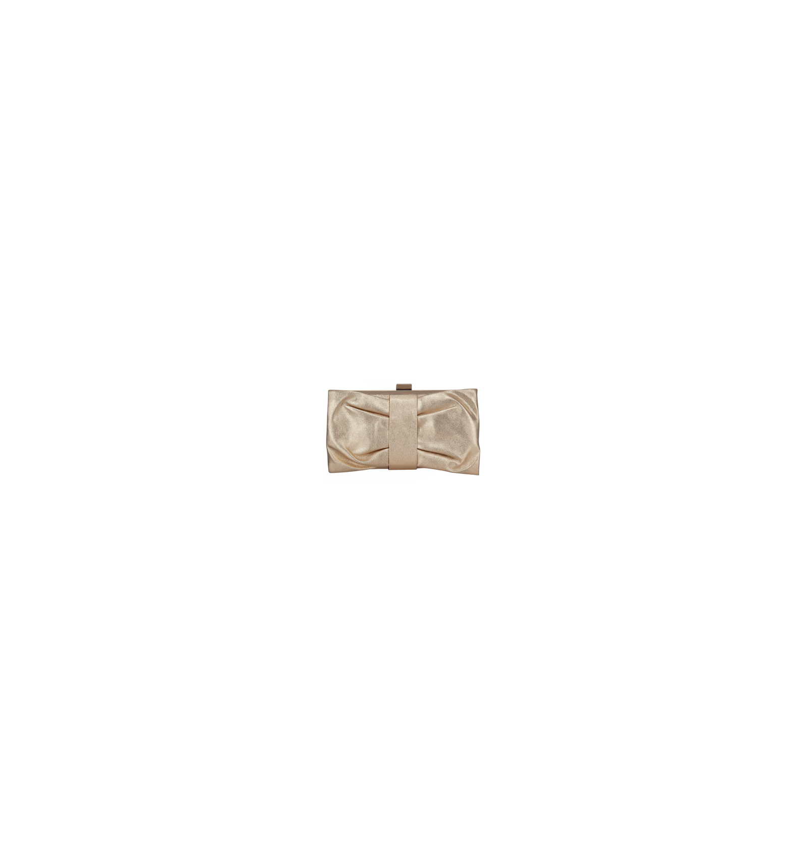 ESTE BOLSO DE MANO TIENE UN DISEÑO UNICO Y ENCANTADOR: ESTA ESTRUCTURADO COMO UN LAZO, CON UN ACABADO METALICO EN TONO DORADO QUE REFLEJA LA LUZ CON CADA MOVIMIENTO. EL CENTRO ESTA FRUNCIDO POR UNA BANDA VERTICAL QUE ACENTUA LA FORMA DEL LAZO, CREANDO UN EFECTO TRIDIMENSIONAL Y FEMENINO.