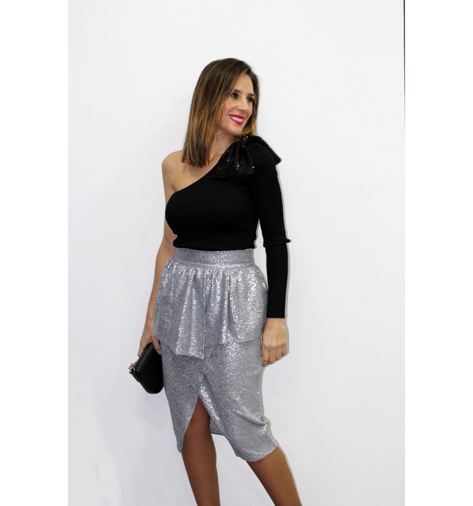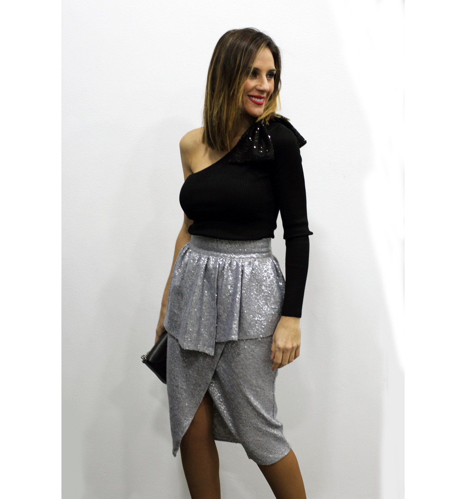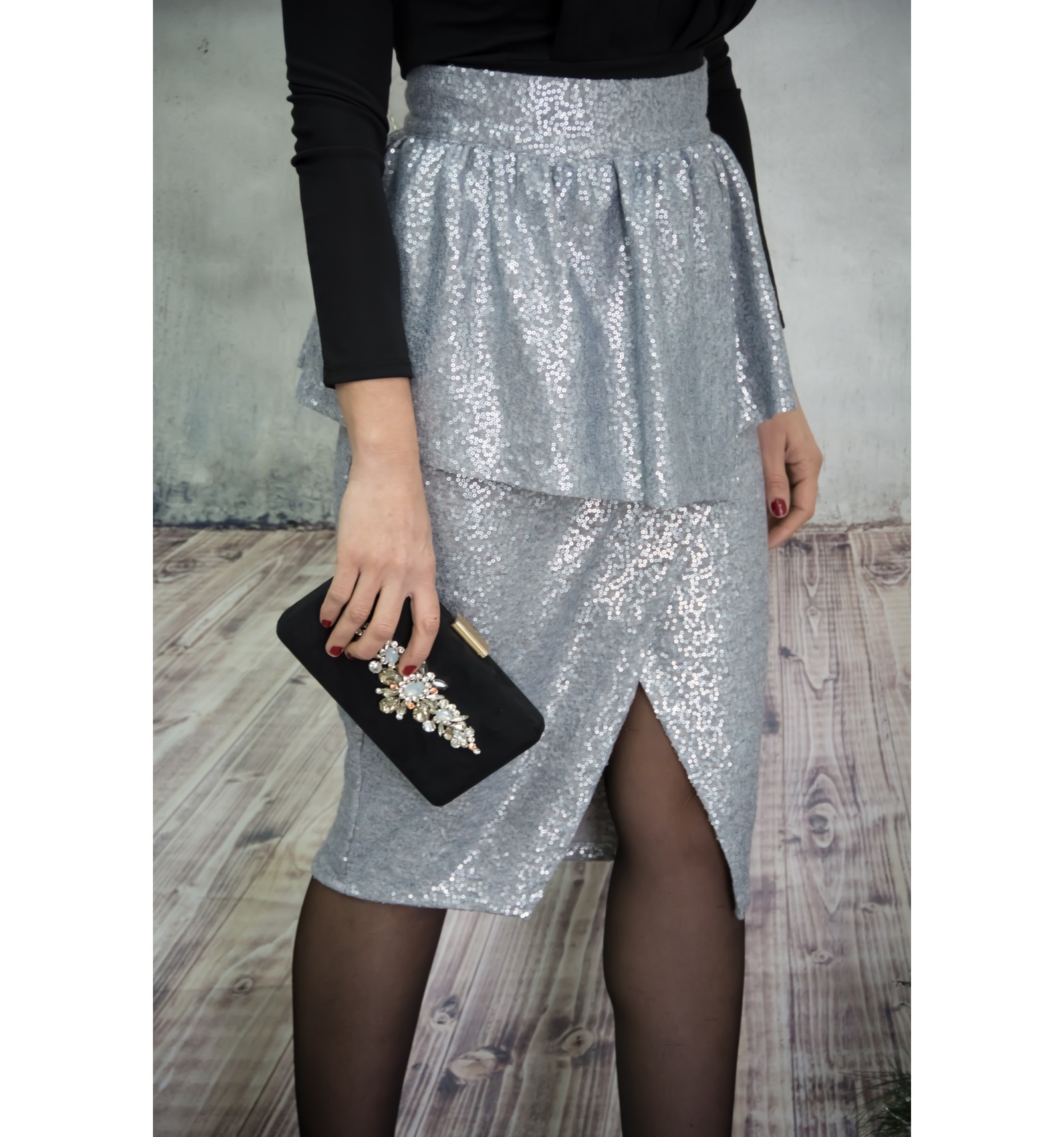 FALDA ESPECTACULAR DE LENTEJUELAS CON TEJIDO FINO DE FELPA Y VOLANTE A LA CINTURA.