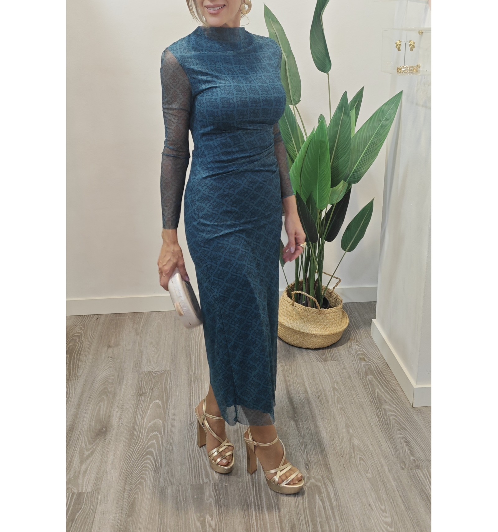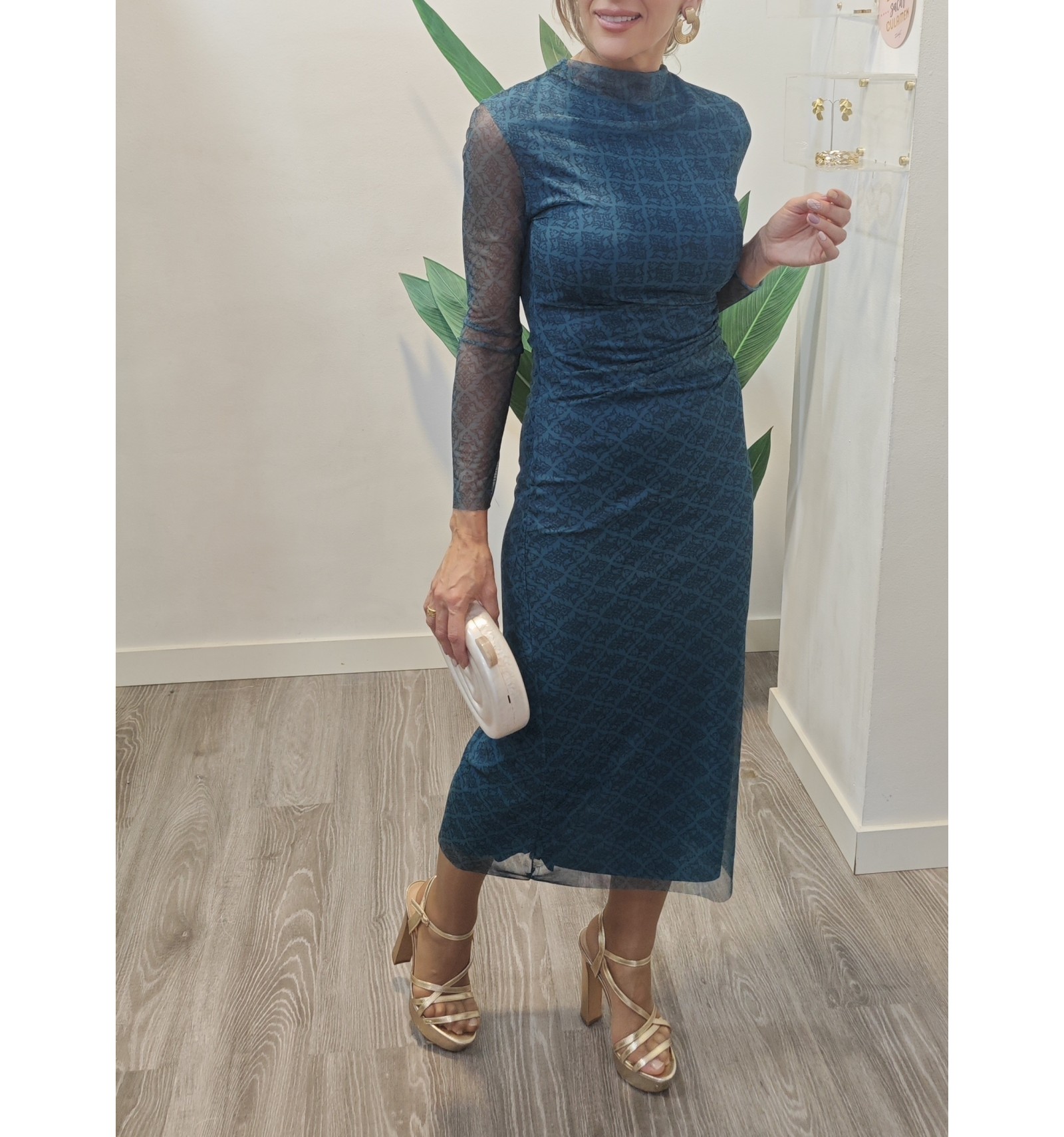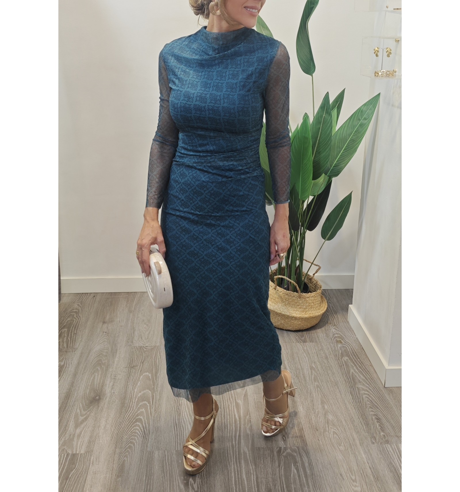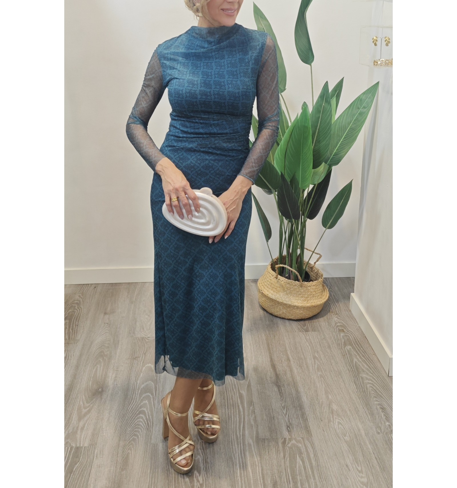 Es un vestido midi estrecho, ideal para eventos de día en los que quieras ir cómoda y elegante. Las mangas con transparencias le dan un toque de originalidad.