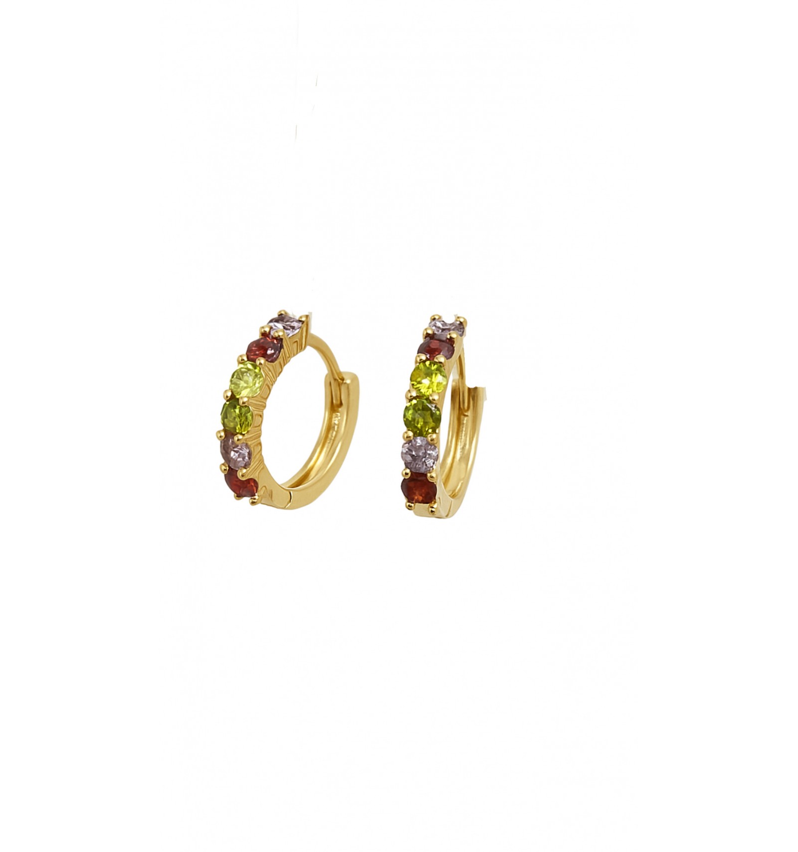 EL DISEÑO PRESENTA UN ARO TRADICIONAL, ADORNADO CON UNA SERIE DE GEMAS DE COLORES VERDE ESMERALDA, PURPURA AMATISTA, Y ROJO RUBI DISPUESTAS EN FORMA SIMETRICA A LO LARGO DEL BORDE EXTERIOR.