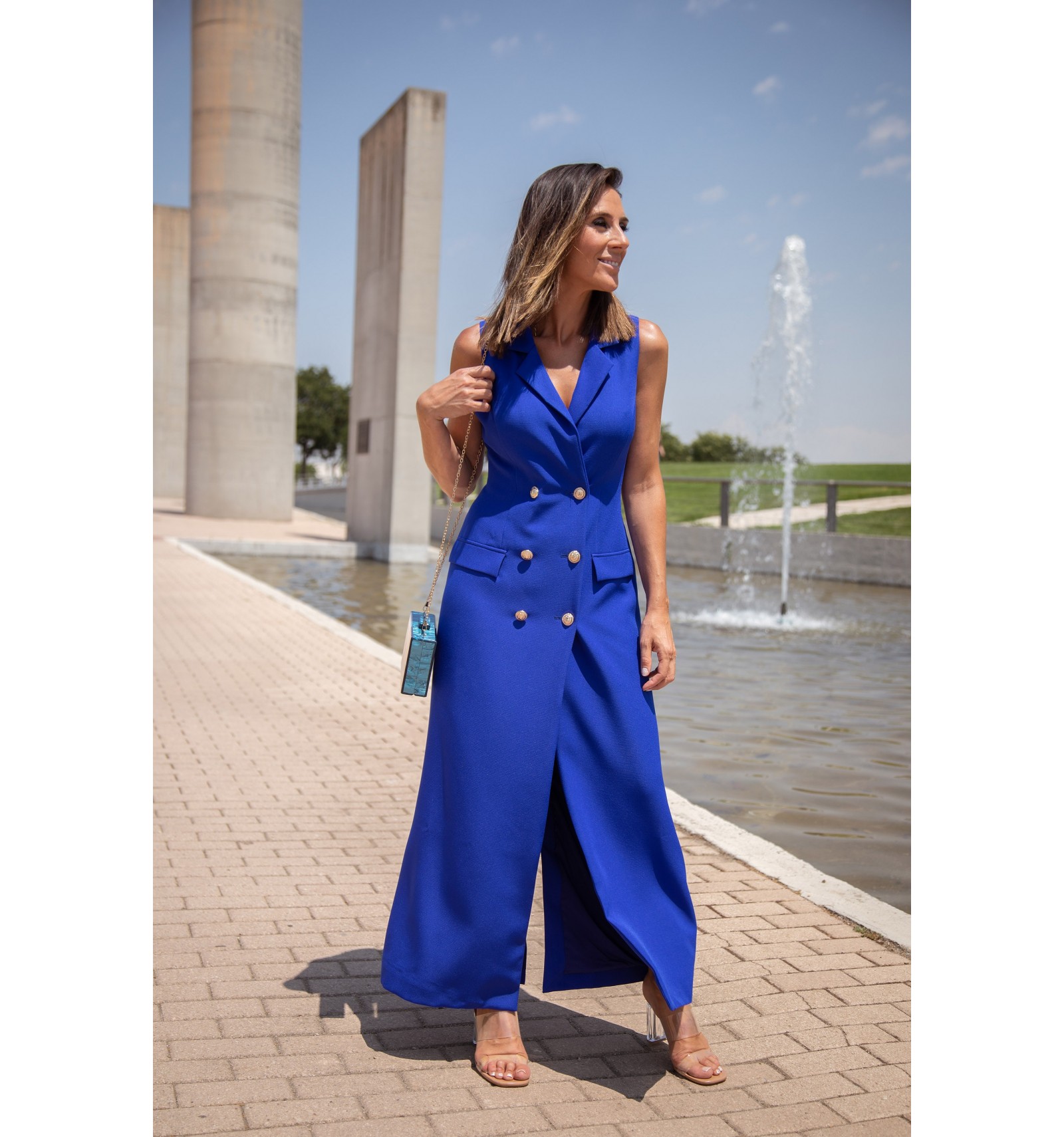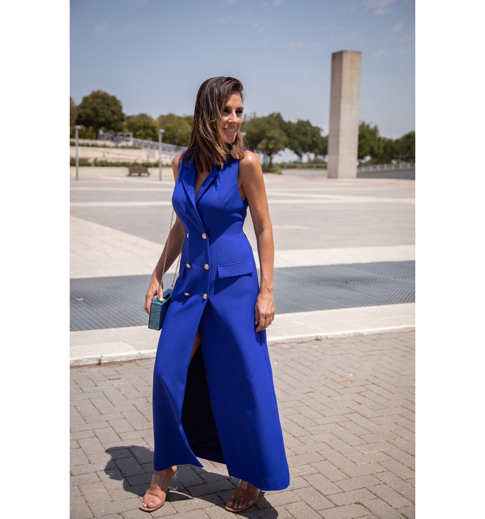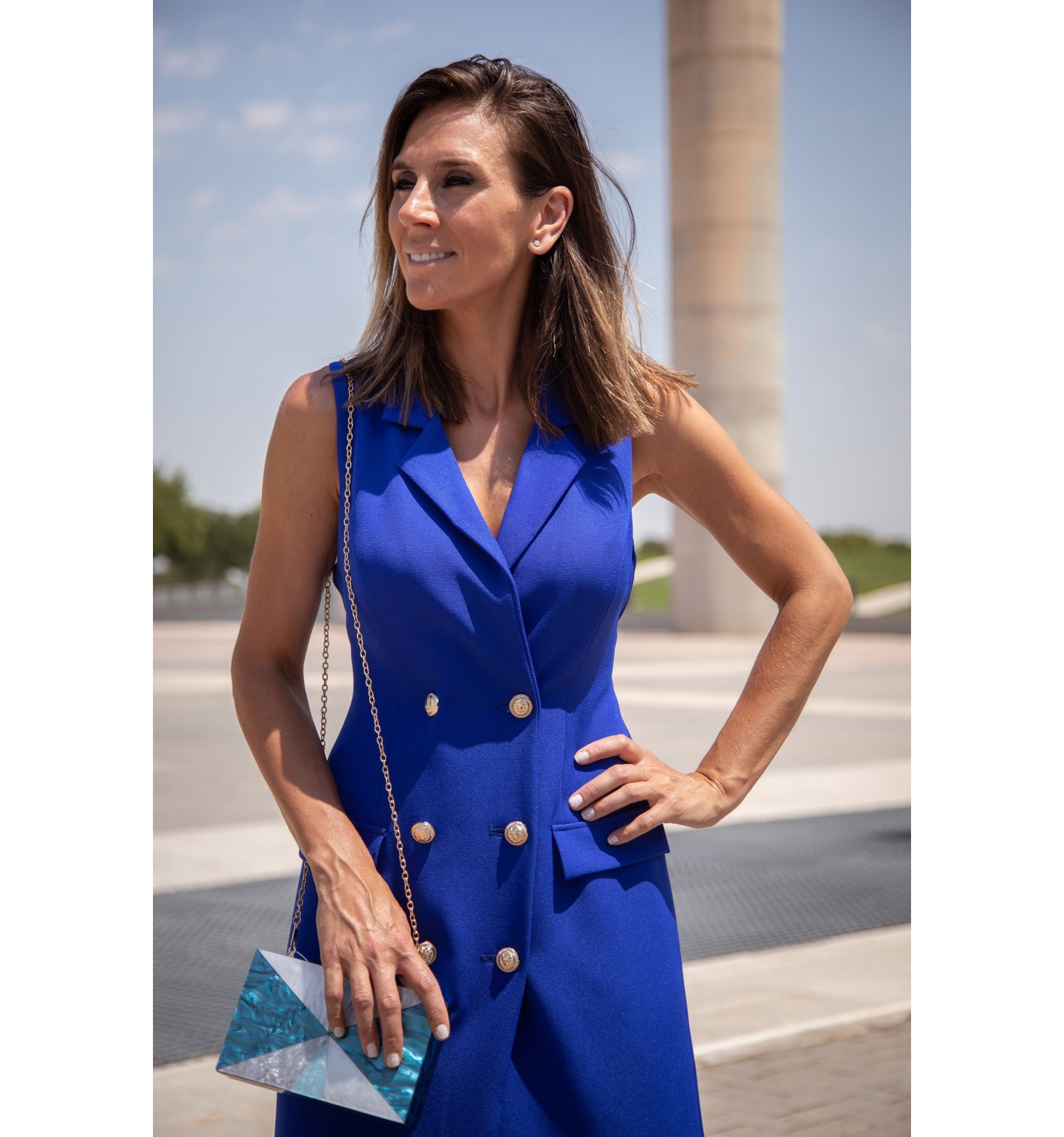 VESTIDO BLAZER CRUZADO SIN MANGAS ENTALLADO,CON 6 BOTONES DORADOS Y SOLAPAS IMITANDO DOS BOLSILLOS Y EN LA PARTE TRASERA ABERTURA.100%POLYESTER