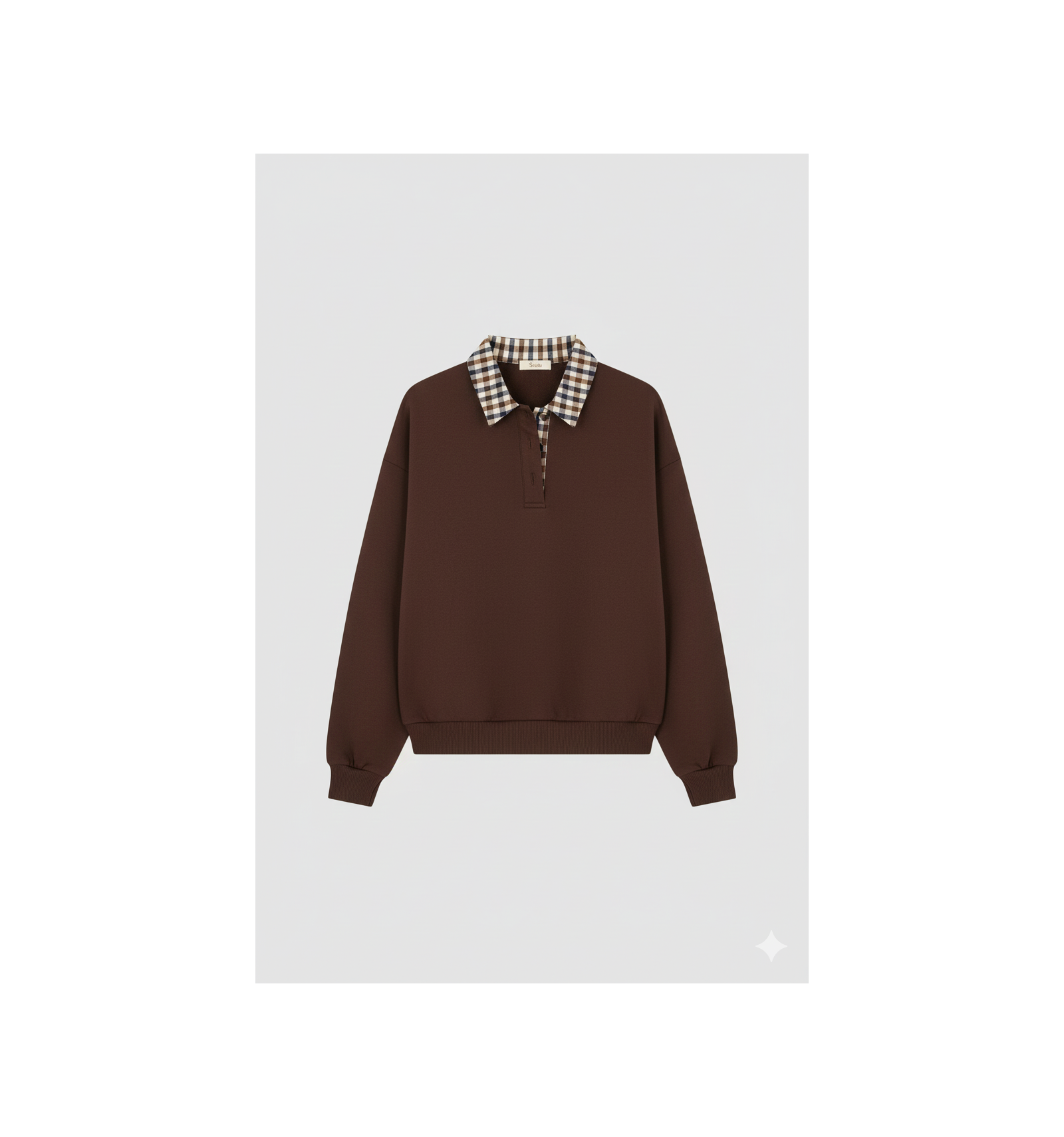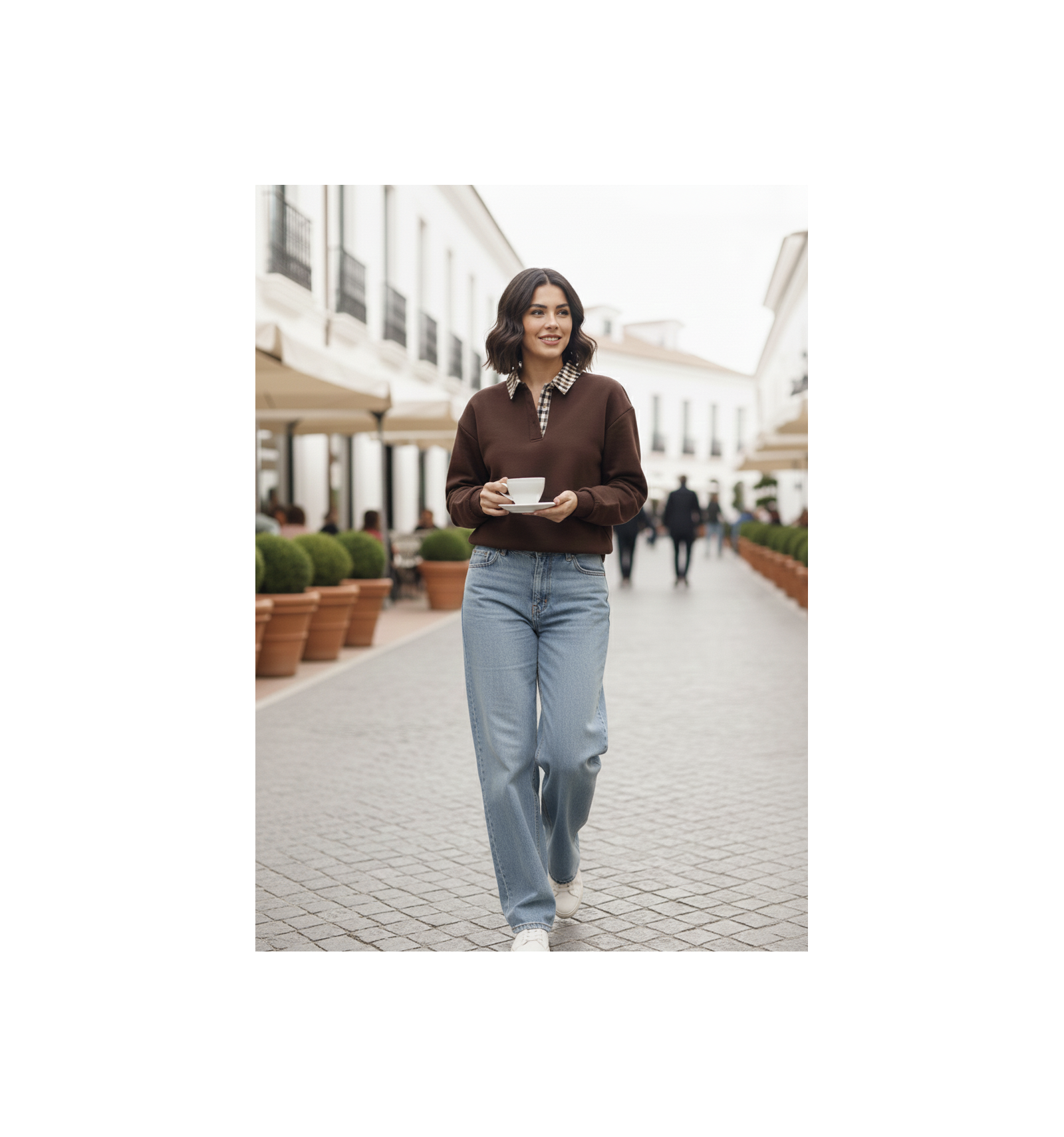 SUDADERA MARRON CON CUELLO CAMISERO DE CUADROS Y BOTONES A JUEGO- ESILO CHIC Y CASUAL.