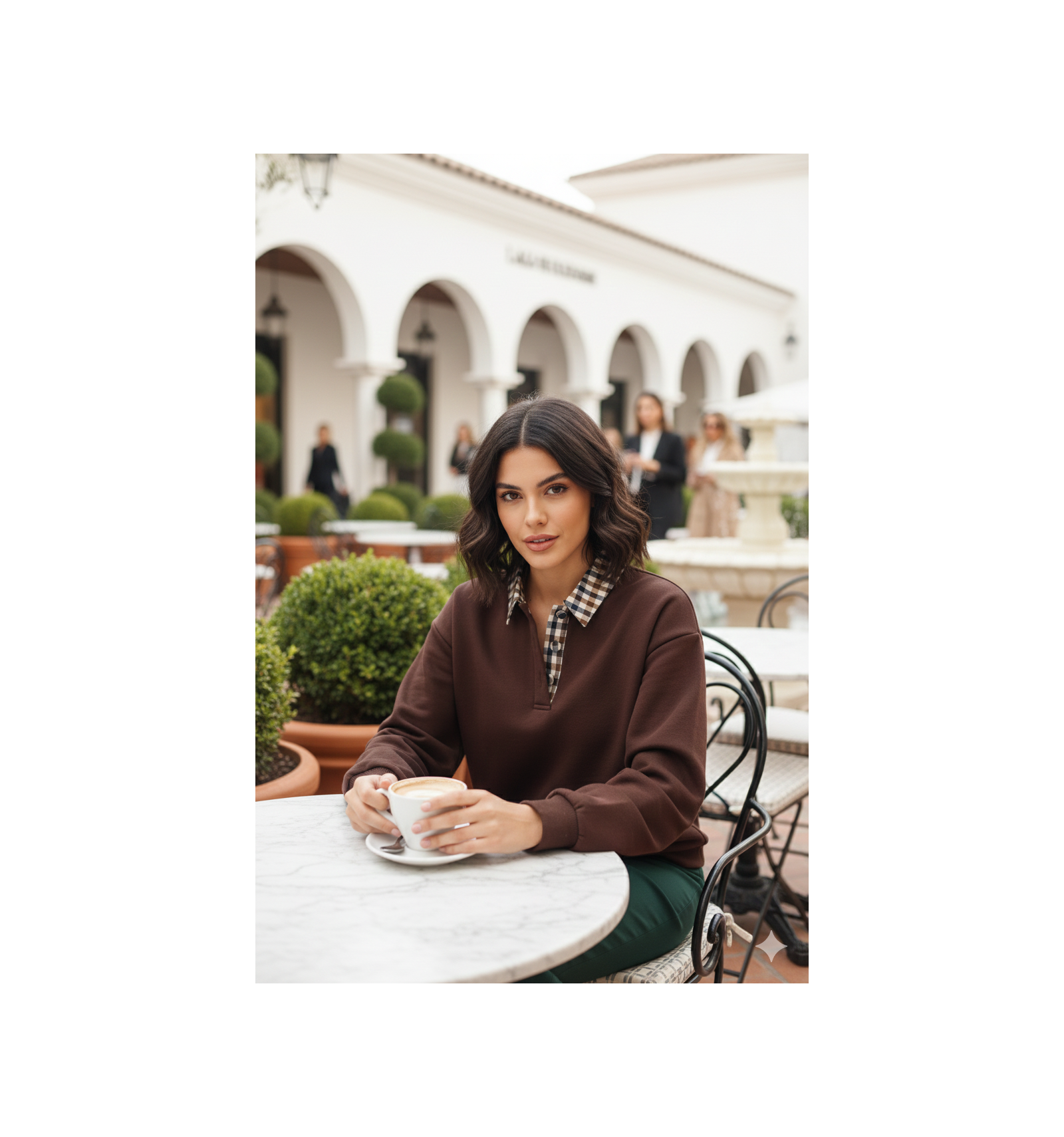ESTA SUDADERA COMBINA COMODIDAD Y ELEGANCIAEN UNA SOLA PRENDA. ESTA CONFECCIONADA EN UN TEJIDO SUAVE Y CALIDO DE COLOR MARRON CHOCOLATE, IDEAL PARA EL DIA A DIA. eL DETALLE DEL CUELLO CAMISERO CON ESTAMPADODE CUADROD EN TONOS BEIGE Y AZUL APORTA UN TOQUE SOSTIFICADO Y DISTINTIVO,ELEVANDO EL LOOK SIN ESFUERZO.