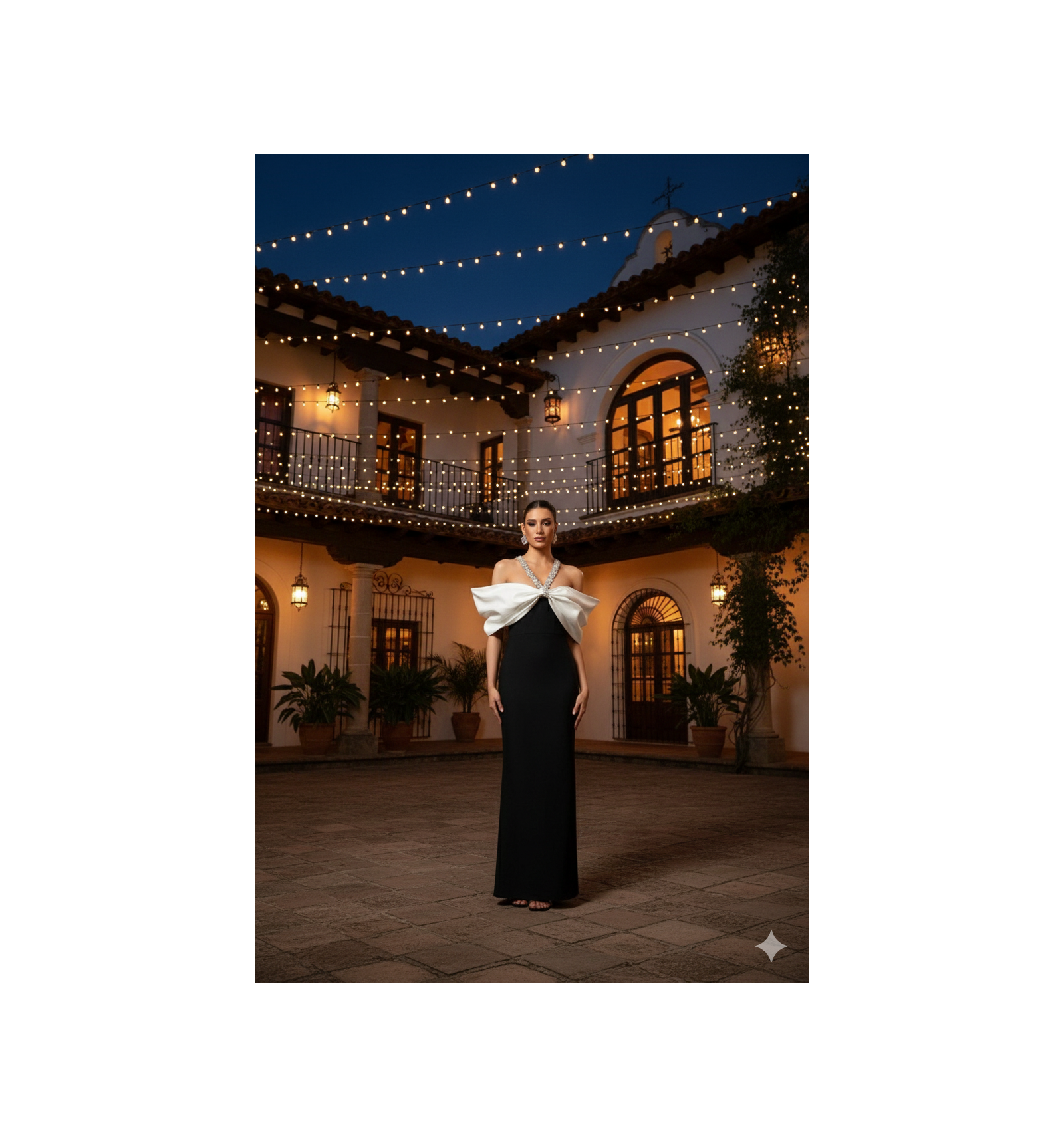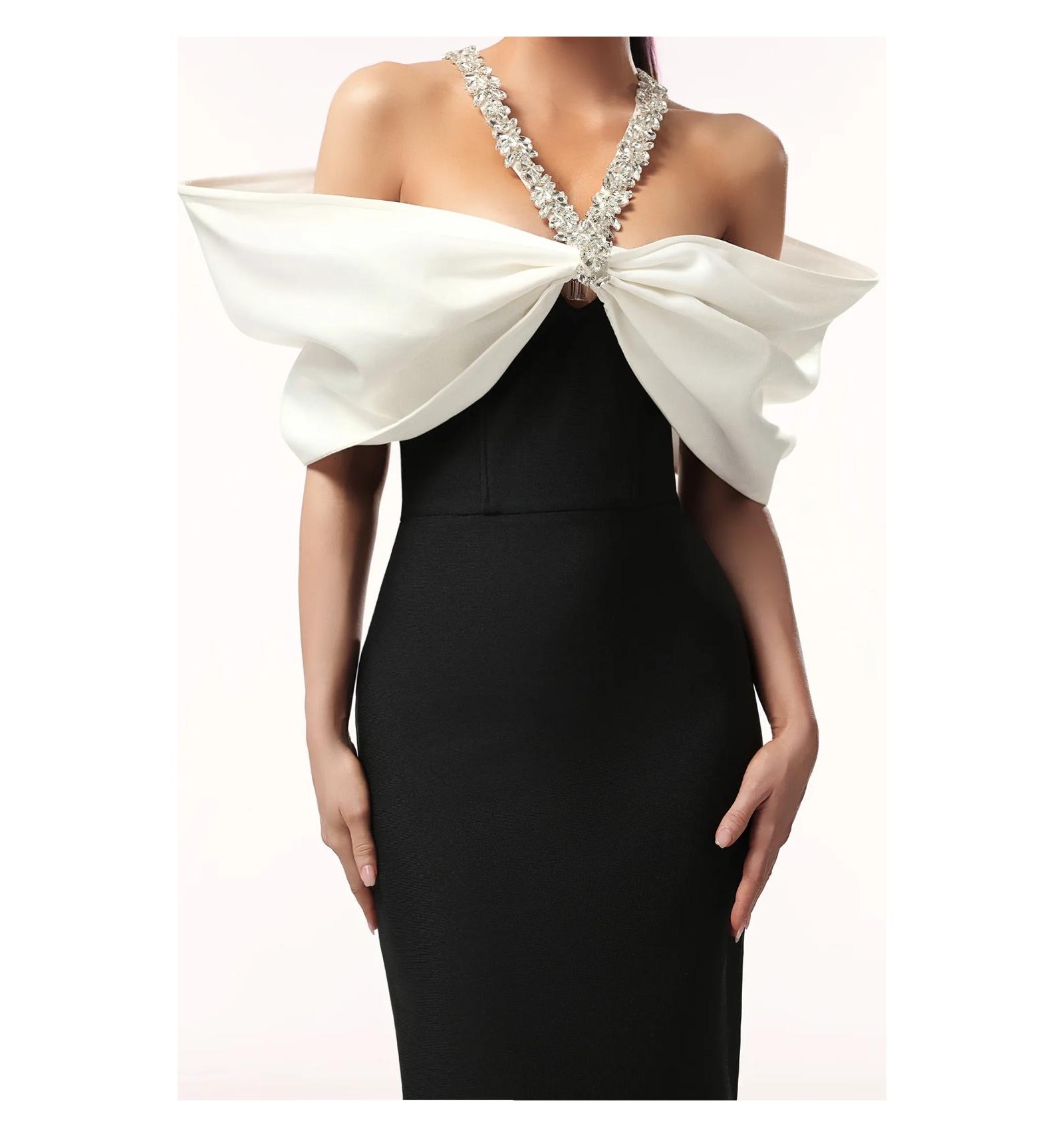 ESTE DISEÑO COMBINA A LA PERFECCION LA SOBRIEDAD DEL NEGRO CON EL IMPACTO VISUAL DE UN GRAN LAZO BLANCO QUE CRUZA EL PECHO EN FORMA DE ESCOTE ASIMETRICO. EL LAZO, RECOGIDO EN EL CENTRO, CREA UN EFECTO ESCULTURAL QUE APORTA VOLUMEN Y DRAMATISMO SIN PERDER LA ELEGANCIA.